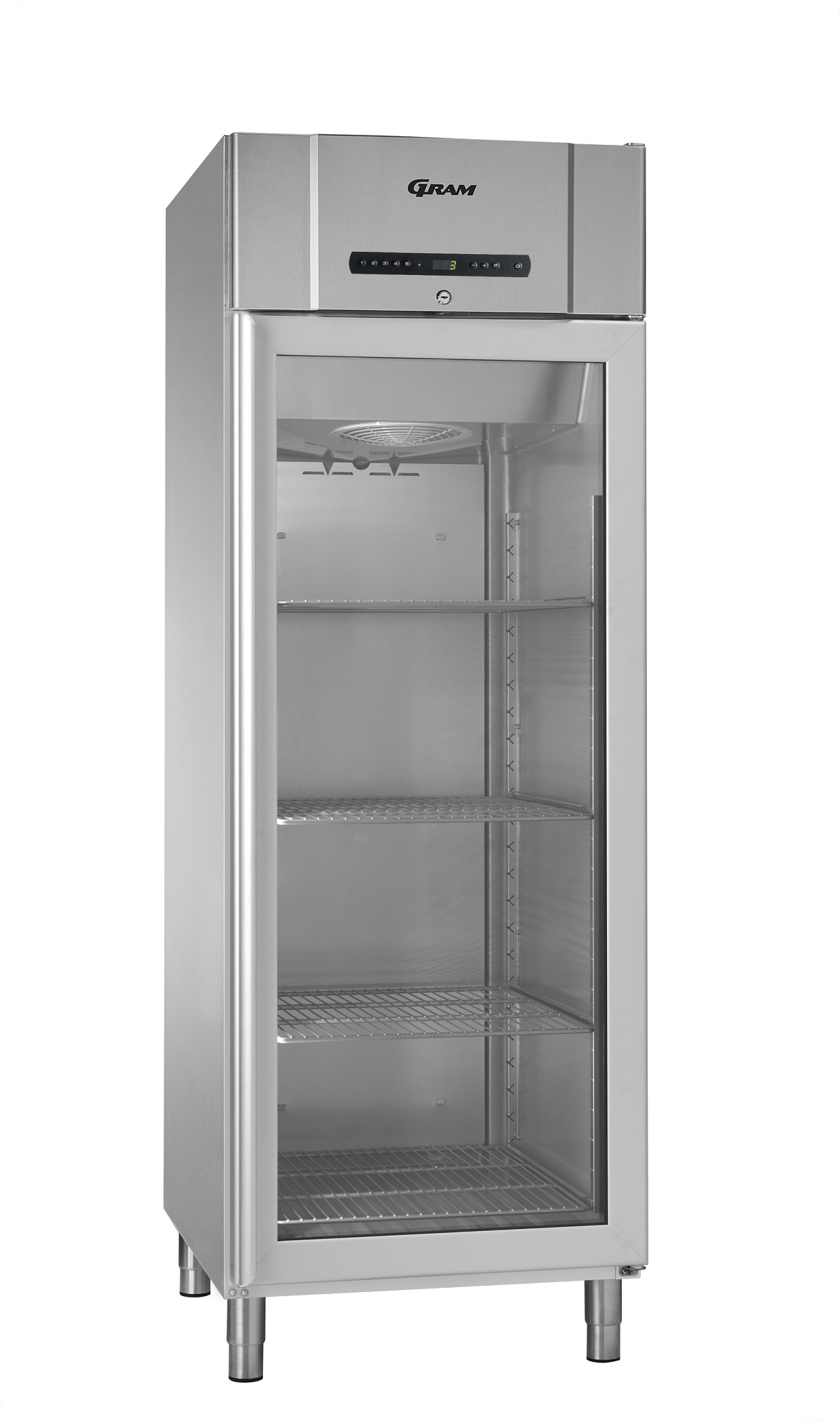 - Equipped with Right hand hinged glass door with lock, and LED light, 4 grey shelves. Exterior: Stainless.
