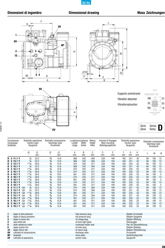 Aplicaciones: Baja Bomba Calor: No Refrigerantes: R404A R22 R134a Desplazamiento m3: 13.50 HP: 2 Potencia con Refrigerante R404A: 8.00 KW Potencia con Refrigerante R404A: 2.57 KW Potencia con Refrigerante R22: 1.38 KW Potencia con Refrigerante R134a: 5.63 KW Potencia con Refrigerante R134a: 6.63 KW Carga inicial de aceite: 1,2 kg Conexión tubería aspiración: 7/8” Conexión tubería descarga:: 5/8” Intensidad en arranque (rotor bloqueado): 35,9 A Intensidad máxima de servicio: 7,1 A Modo lubricación: Sin bomba de aceite Número de cilindros/taladro/cilindrada: 2 Peso: 46 kg Protección motor: PTC 130°C Relación de bobinado: 50% / 50% Sobrepresión máxima admisible: 20,5 / 30 bar Tipo de aceite: FRASCOLD POE 32 Tipo de enfriamiento motor: Por gas de aspiración Tipo de protección caja de bornes:IP54 Tipo protección motor: ECA01 Velocidad: 1450 rpmModelos: (Baja Temperatura R22)