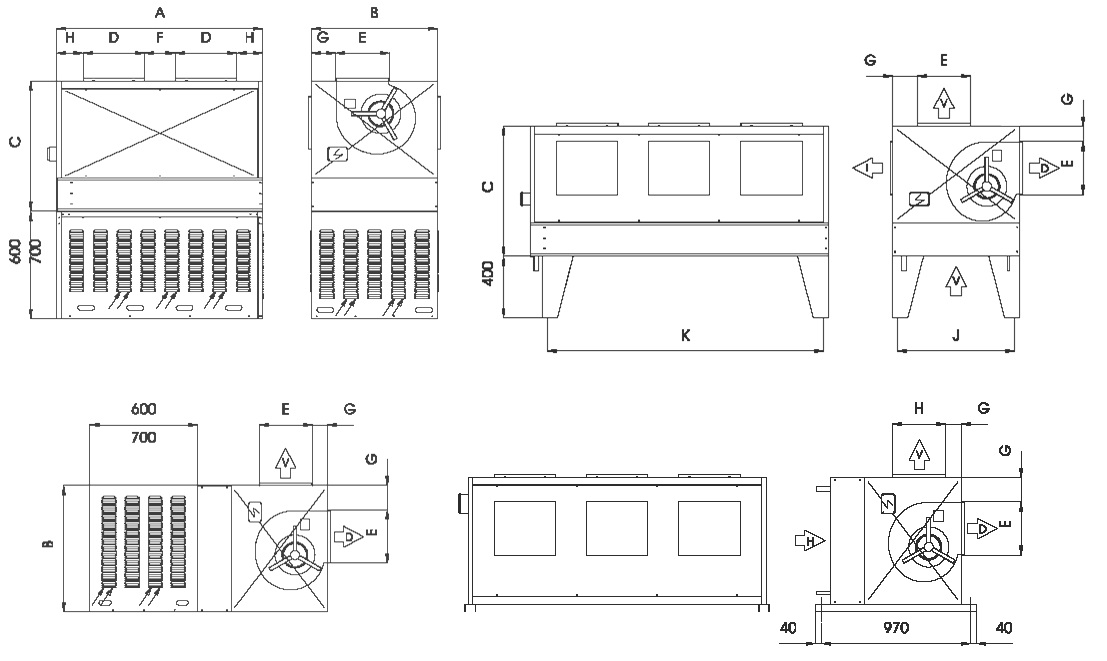 Posibilidad de suministro: Entrada de aire vertical, salida vertical (V-V), salida horizontal derecha (V-D), salida horizontal izquierda (V-I). Entrada de aire horizontal, salida vertical (H-V), salida horizontal derecha (H-D).